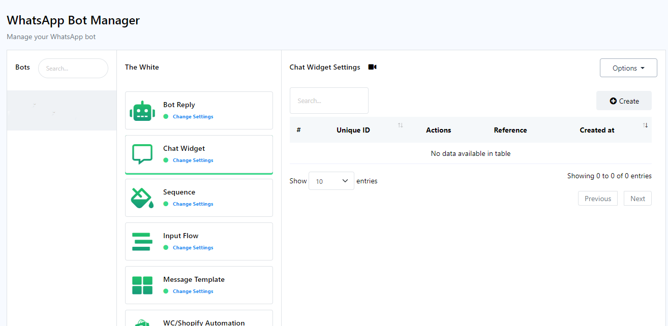 - Within the WhatsApp Bot Manager, select the `Chat Widget` section and click on the `Create` button. Make sure the WhatsApp bot account is selected for which the chat widget will be created