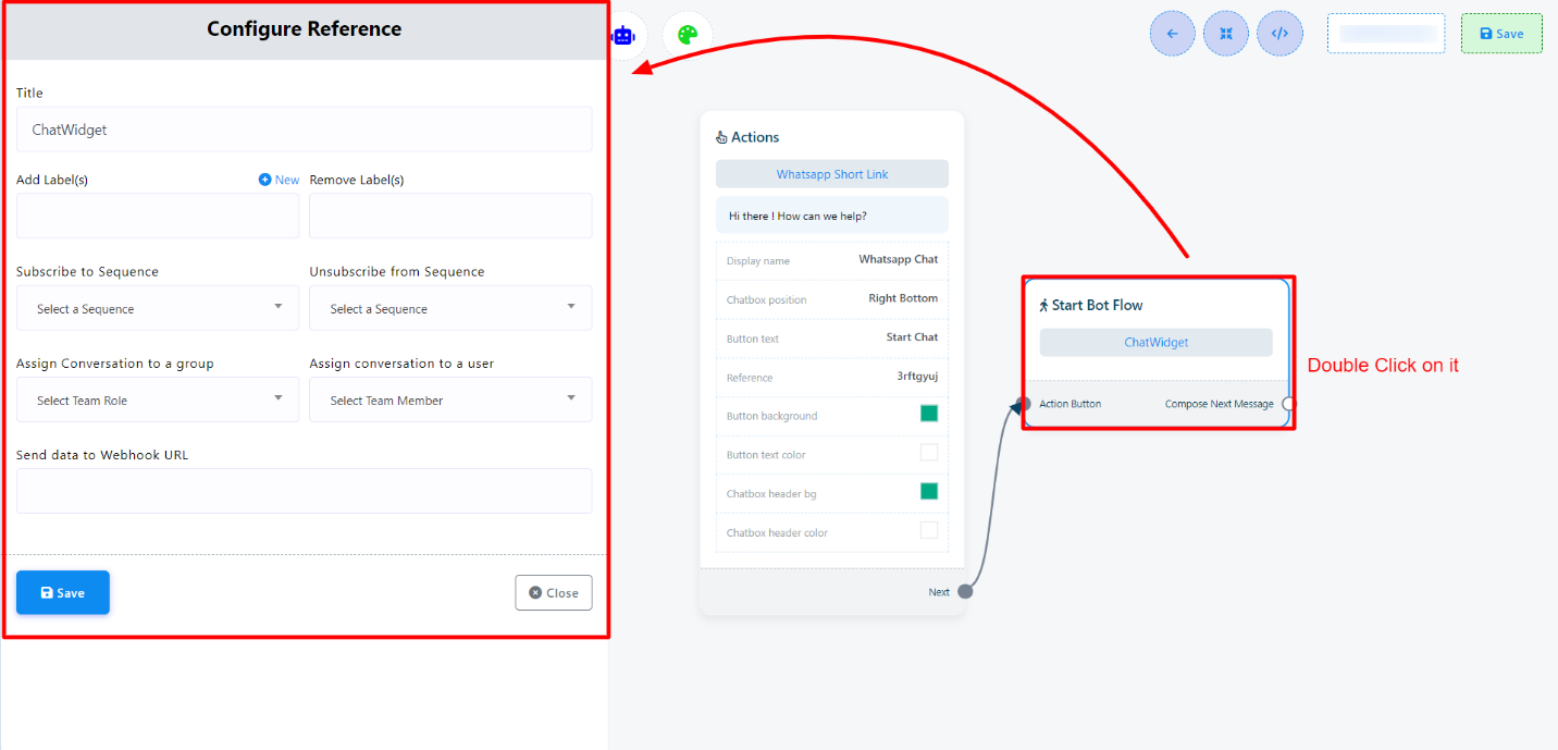 - Double click on the `Start Bot Flow` and provide a name for it. Also, there are options for adding label, sequence and assigning conversation to an agent or team member.